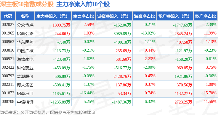 资金流向方面,深主板50(399750)指数成份股当日主力资金净流出合计65.23亿元,游资资金净流入合计11.99亿元,散户资金净流入合计53.23亿元。成份股资金流向详情见下表: