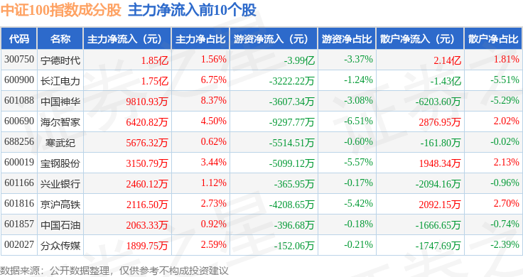 资金流向方面,中证100(399903)指数成份股当日主力资金净流出合计230.64亿元,游资资金净流入合计71.45亿元,散户资金净流入合计159.19亿元。成份股资金流向详情见下表:
