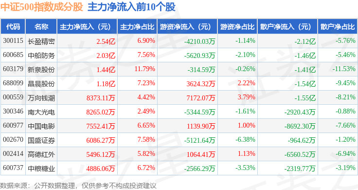 资金流向方面,中证500(399905)指数成份股当日主力资金净流出合计322.64亿元,游资资金净流入合计56.65亿元,散户资金净流入合计265.99亿元。成份股资金流向详情见下表:
