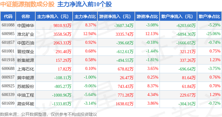 资金流向方面,中证能源(399928)指数成份股当日主力资金净流出合计5.57亿元,游资资金净流入合计641.96万元,散户资金净流入合计5.5亿元。成份股资金流向详情见下表: