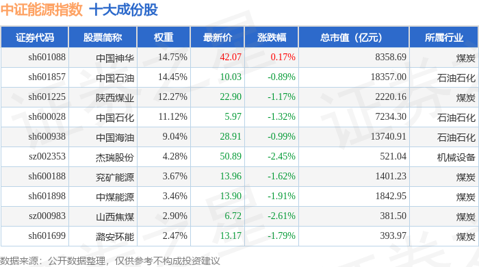 证券之星消息,11月21日,中证能源(399928)指数报收于2940.49点,跌1.59%,成交133.24亿元,换手率0.42%。当日该指数成份股中,上涨的有1家,中国神华以0.17%的涨幅领涨,下跌的有24家,美锦能源以7.82%的跌幅领跌。
