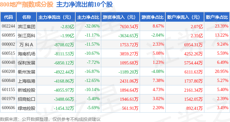 资金流向方面,800地产(399965)指数成份股当日主力资金净流出合计9.3亿元,游资资金净流入合计1.57亿元,散户资金净流入合计7.73亿元。成份股资金流向详情见下表: