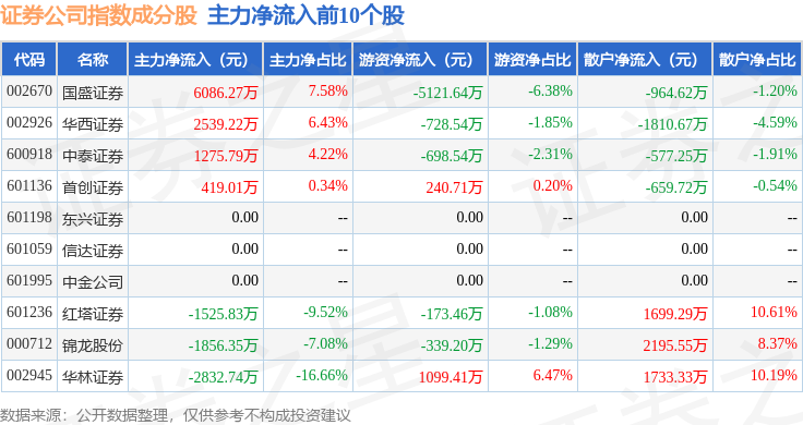 资金流向方面,证券公司(399975)指数成份股当日主力资金净流出合计65.23亿元,游资资金净流入合计21.22亿元,散户资金净流入合计44.01亿元。成份股资金流向详情见下表: