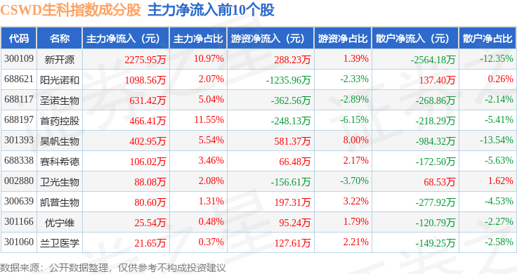 资金流向方面,CSWD生科(399993)指数成份股当日主力资金净流出合计21.4亿元,游资资金净流入合计2.5亿元,散户资金净流入合计18.33亿元。成份股资金流向详情见下表: