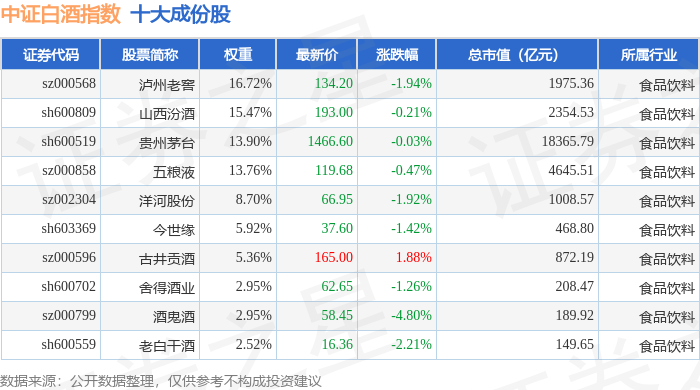证券之星消息,11月21日,中证白酒(399997)指数报收于9700.64点,跌1.11%,成交160.59亿元,换手率0.97%。当日该指数成份股中,上涨的有1家,古井贡酒以1.88%的涨幅领涨,下跌的有18家,酒鬼酒以4.8%的跌幅领跌。