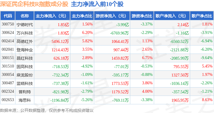 资金流向方面,深证民企科技R(470059)指数成份股当日主力资金净流出合计69.6亿元,游资资金净流入合计11.3亿元,散户资金净流入合计58.29亿元。成份股资金流向详情见下表: