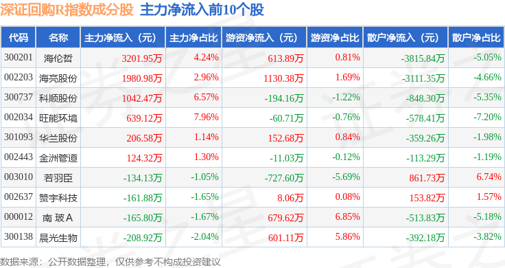 资金流向方面,深证回购R(470063)指数成份股当日主力资金净流出合计10.14亿元,游资资金净流入合计4.74亿元,散户资金净流入合计5.41亿元。成份股资金流向详情见下表: