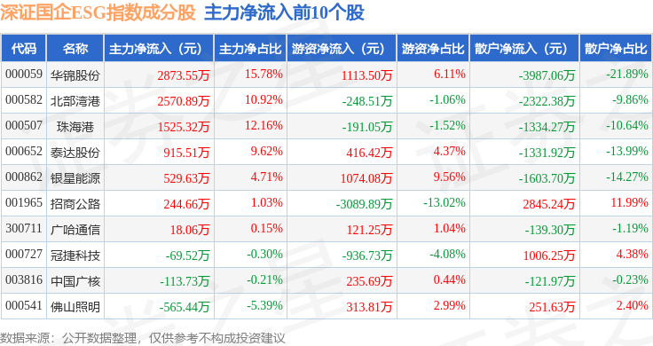 资金流向方面,深证国企ESG(970055)指数成份股当日主力资金净流出合计29.13亿元,游资资金净流入合计3.07亿元,散户资金净流入合计26.06亿元。成份股资金流向详情见下表: