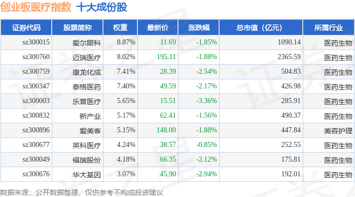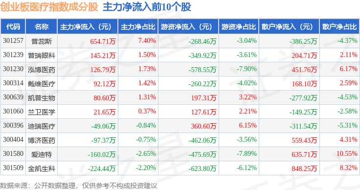 资金流向方面,创业板医疗(970082)指数成份股当日主力资金净流出合计14.23亿元,游资资金净流入合计1.06亿元,散户资金净流入合计13.17亿元。成份股资金流向详情见下表: