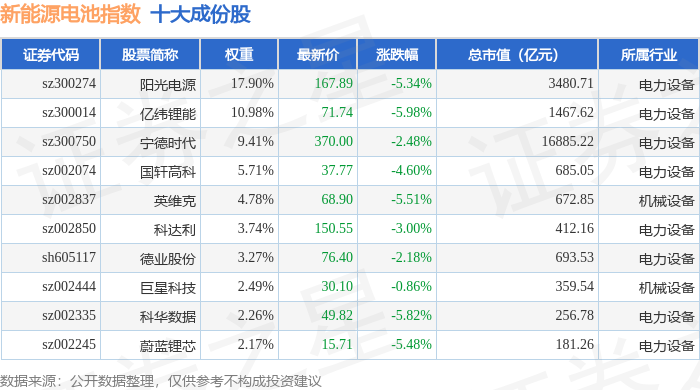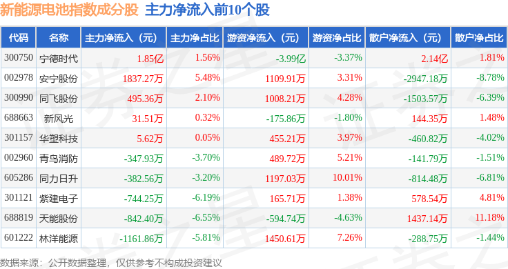 资金流向方面,新能源电池(980027)指数成份股当日主力资金净流出合计45.0亿元,游资资金净流入合计5.57亿元,散户资金净流入合计39.43亿元。成份股资金流向详情见下表: