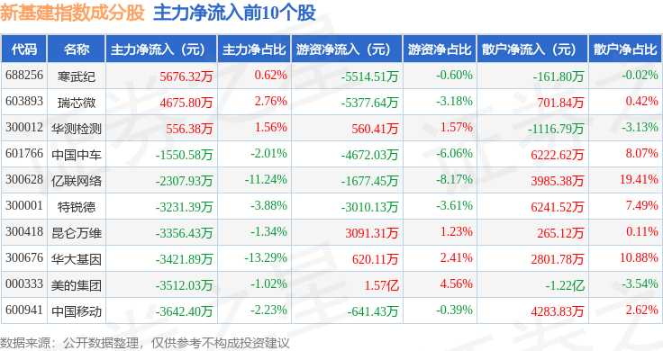 资金流向方面,新基建(980029)指数成份股当日主力资金净流出合计130.72亿元,游资资金净流入合计43.82亿元,散户资金净流入合计86.9亿元。成份股资金流向详情见下表:
