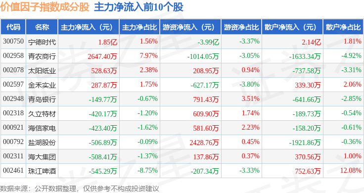 资金流向方面,价值因子(980056)指数成份股当日主力资金净流出合计20.63亿元,游资资金净流入合计8725.21万元,散户资金净流入合计19.76亿元。成份股资金流向详情见下表: