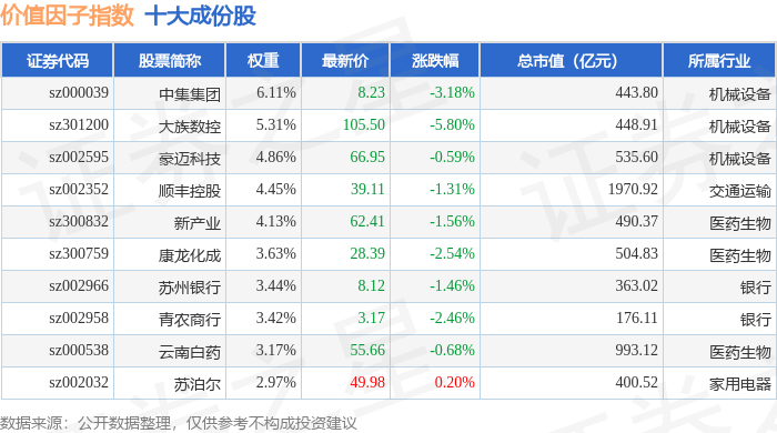 证券之星消息,11月21日,价值因子(980056)指数报收于2527.47点,跌2.56%,成交451.8亿元,换手率1.35%。当日该指数成份股中,上涨的有4家,海大集团以1.45%的涨幅领涨,下跌的有45家,中伟股份以9.86%的跌幅领跌。