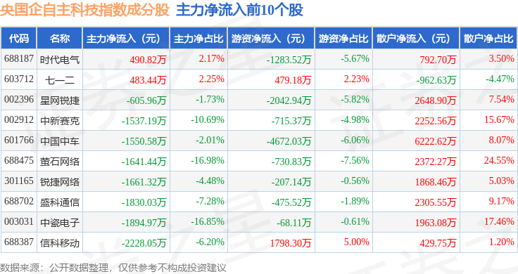 资金流向方面,央国企自主科技(980083)指数成份股当日主力资金净流出合计60.44亿元,游资资金净流入合计17.24亿元,散户资金净流入合计43.2亿元。成份股资金流向详情见下表: