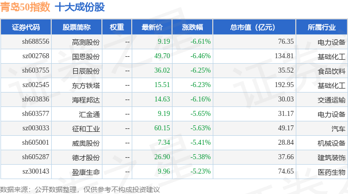 青岛50(989011)指数十大成份股详情如下: