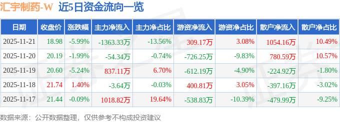 证券之星消息,截至2025年11月21日收盘,汇宇制药(688553)报收于18.98元,下跌5.99%,换手率1.51%,成交量5.2万手,成交额1.01亿元。