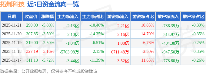 证券之星消息,截至2025年11月21日收盘,拓荆科技(688072)报收于290.0元,下跌5.8%,换手率2.46%,成交量6.92万手,成交额20.39亿元。