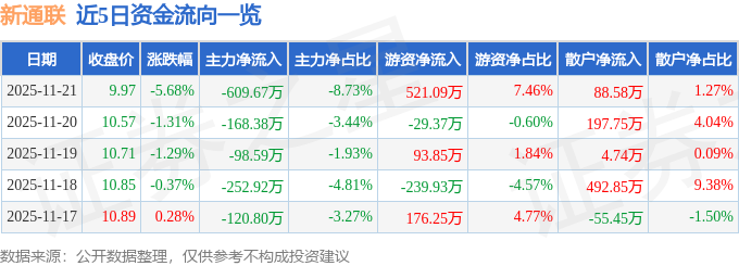 证券之星消息,截至2025年11月21日收盘,新通联(603022)报收于9.97元,下跌5.68%,换手率3.42%,成交量6.85万手,成交额6981.98万元。