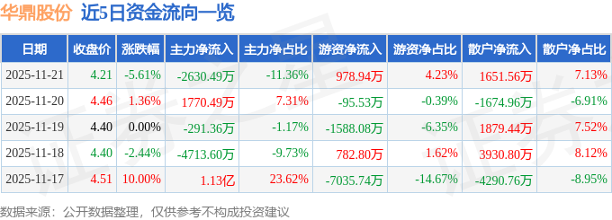 证券之星消息,截至2025年11月21日收盘,华鼎股份(601113)报收于4.21元,下跌5.61%,换手率4.89%,成交量54.03万手,成交额2.32亿元。