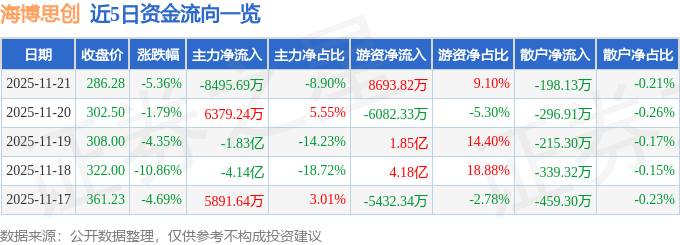 证券之星消息,截至2025年11月21日收盘,海博思创(688411)报收于286.28元,下跌5.36%,换手率8.6%,成交量3.26万手,成交额9.55亿元。