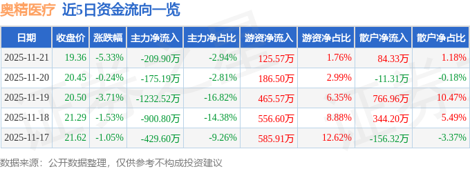 证券之星消息,截至2025年11月21日收盘,奥精医疗(688613)报收于19.36元,下跌5.33%,换手率2.65%,成交量3.63万手,成交额7150.24万元。