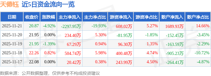 证券之星消息,截至2025年11月21日收盘,天德钰(688252)报收于20.87元,下跌4.92%,换手率2.98%,成交量5.44万手,成交额1.15亿元。