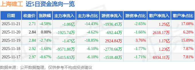 证券之星消息,截至2025年11月21日收盘,上海建工(600170)报收于2.71元,下跌4.58%,换手率2.98%,成交量264.93万手,成交额7.32亿元。