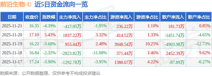 证券之星消息,截至2025年11月21日收盘,前沿生物(688221)报收于16.35元,下跌4.39%,换手率3.42%,成交量12.83万手,成交额2.15亿元。