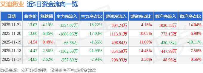 证券之星消息,截至2025年11月21日收盘,艾迪药业(688488)报收于13.03元,下跌4.19%,换手率1.31%,成交量5.53万手,成交额7269.92万元。