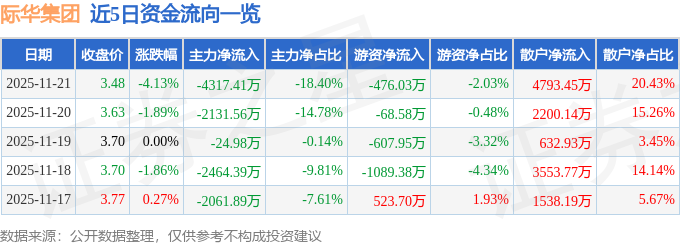 证券之星消息,截至2025年11月21日收盘,际华集团(601718)报收于3.48元,下跌4.13%,换手率1.52%,成交量66.61万手,成交额2.35亿元。