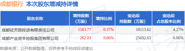 证券之星消息,11月21日成都银行发布公告《成都银行:成都银行股份有限公司关于实际控制人控制的股东增持计划进展公告》,其股东成都欣天颐投资有限责任公司、成都产业资本控股集团有限公司于2025年9月5日至2025年11月21日间合计增持1845.8万股,占公司目前总股本的0.4355%,变动期间该股股价下跌8.13%,截止11月21日收盘报16.72元。