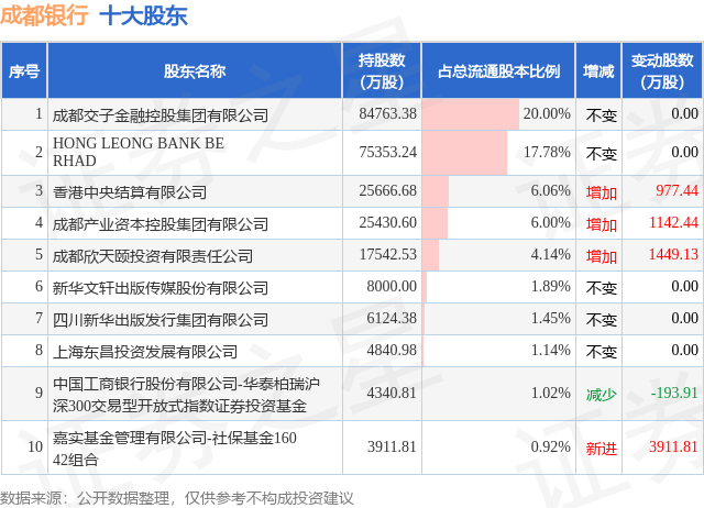 根据成都银行2025年三季报公布的十大股东详情如下:
