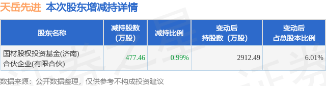 证券之星消息,11月21日天岳先进发布公告《天岳先进:关于持股5%以上股东减持股份结果公告》,其股东国材股权投资基金(济南)合伙企业(有限合伙)于2025年9月27日至2025年11月20日间合计减持477.46万股,占公司目前总股本的0.9852%,变动期间该股股价下跌7.36%,截止11月20日收盘报79.98元。