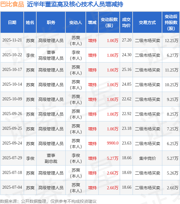 证券之星消息,根据11月21日市场公开信息、上市公司公告及交易所披露数据整理,巴比食品(605338)最新董监高及相关人员股份变动情况:2025年11月21日公司高级管理人员苏爽共增持公司股份1.0万股,占公司总股本为0.0042%。变动期间公司股价下跌2.17%,11月21日当日收盘报27.1元。