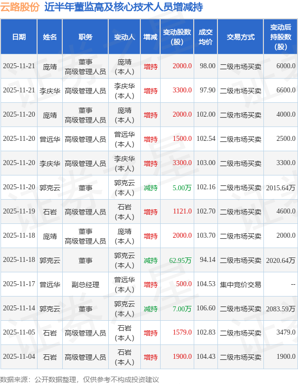 云路股份近半年内的董监高及核心技术人员增减持详情如下: