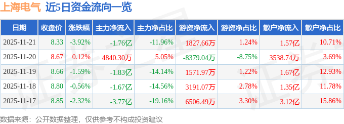证券之星消息,截至2025年11月21日收盘,上海电气(601727)报收于8.33元,下跌3.92%,换手率1.38%,成交量173.84万手,成交额14.69亿元。