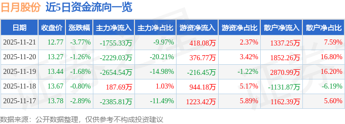 证券之星消息,截至2025年11月21日收盘,日月股份(603218)报收于12.77元,下跌3.77%,换手率1.33%,成交量13.65万手,成交额1.76亿元。