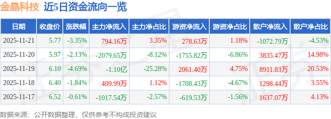 证券之星消息,截至2025年11月21日收盘,金晶科技(600586)报收于5.77元,下跌3.35%,换手率2.85%,成交量40.42万手,成交额2.37亿元。