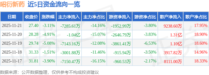 证券之星消息,截至2025年11月21日收盘,昭衍新药(603127)报收于27.4元,下跌3.11%,换手率2.97%,成交量18.73万手,成交额5.15亿元。