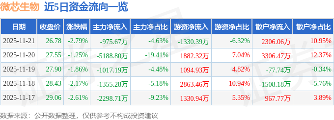 证券之星消息,截至2025年11月21日收盘,微芯生物(688321)报收于26.78元,下跌2.79%,换手率1.91%,成交量7.77万手,成交额2.11亿元。