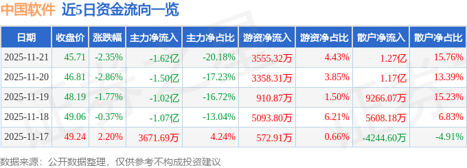 证券之星消息,截至2025年11月21日收盘,中国软件(600536)报收于45.71元,下跌2.35%,换手率2.06%,成交量17.38万手,成交额8.03亿元。