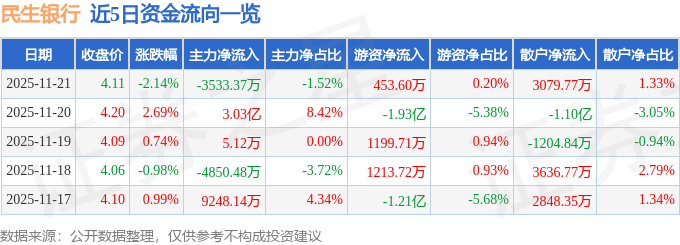 证券之星消息,截至2025年11月21日收盘,民生银行(600016)报收于4.11元,下跌2.14%,换手率1.58%,成交量559.15万手,成交额23.24亿元。