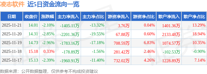 证券之星消息,截至2025年11月21日收盘,凌志软件(688588)报收于14.01元,下跌2.1%,换手率1.87%,成交量7.46万手,成交额1.05亿元。