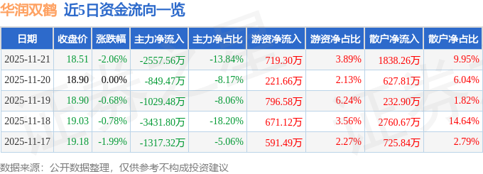 证券之星消息,截至2025年11月21日收盘,华润双鹤(600062)报收于18.51元,下跌2.06%,换手率0.96%,成交量9.92万手,成交额1.85亿元。