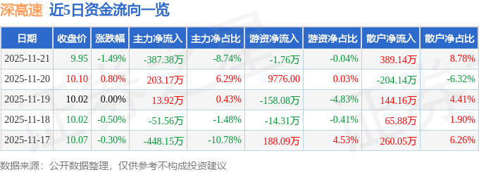 证券之星消息,截至2025年11月21日收盘,深高速(600548)报收于9.95元,下跌1.49%,换手率0.26%,成交量4.43万手,成交额4434.41万元。