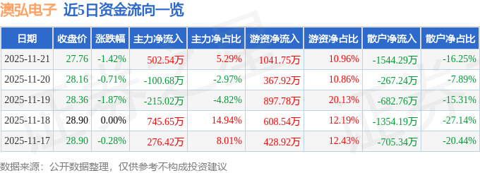 证券之星消息,截至2025年11月21日收盘,澳弘电子(605058)报收于27.76元,下跌1.42%,换手率2.35%,成交量3.36万手,成交额9501.14万元。
