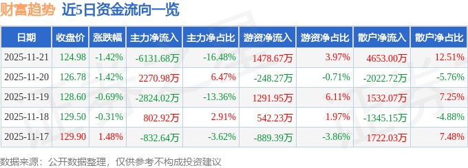 证券之星消息,截至2025年11月21日收盘,财富趋势(688318)报收于124.98元,下跌1.42%,换手率1.15%,成交量2.95万手,成交额3.72亿元。