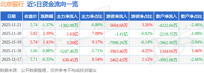 证券之星消息,截至2025年11月21日收盘,北京银行(601169)报收于5.74元,下跌1.37%,换手率1.4%,成交量295.61万手,成交额17.17亿元。