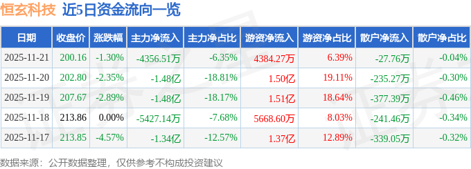 证券之星消息,截至2025年11月21日收盘,恒玄科技(688608)报收于200.16元,下跌1.3%,换手率2.02%,成交量3.4万手,成交额6.86亿元。