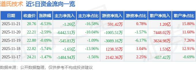 证券之星消息,截至2025年11月21日收盘,道氏技术(300409)报收于20.76元,下跌6.53%,换手率5.22%,成交量35.92万手,成交额7.58亿元。